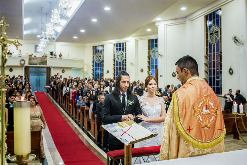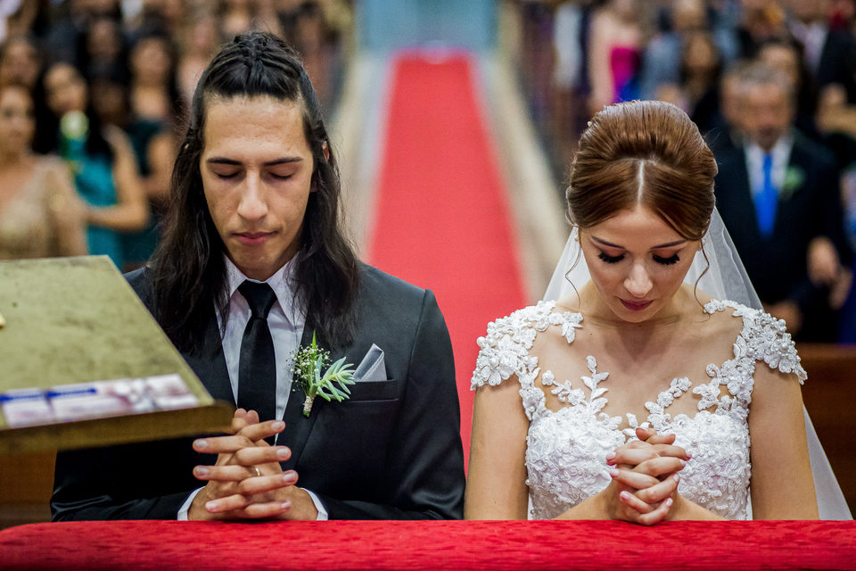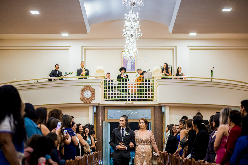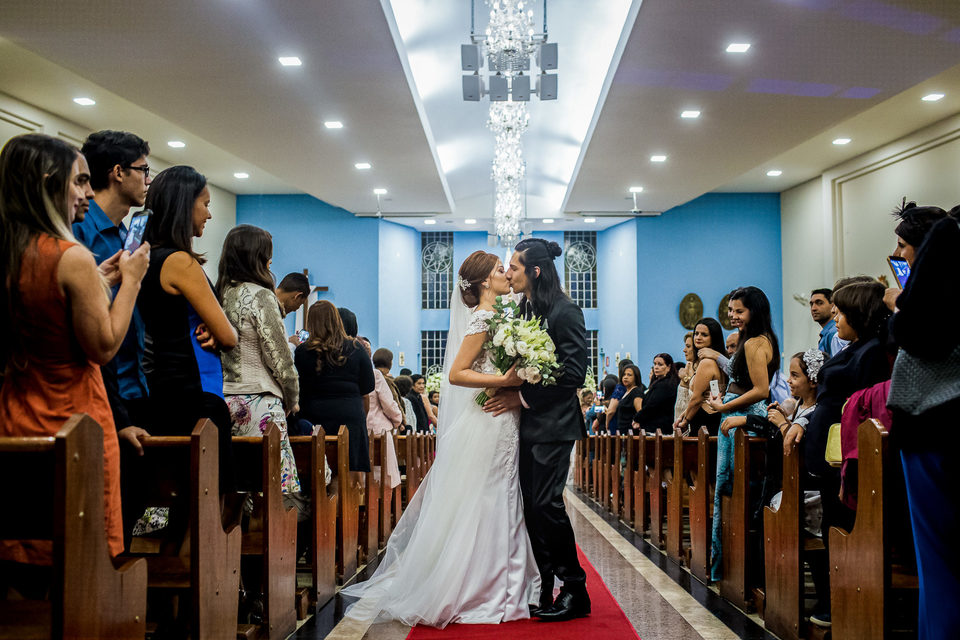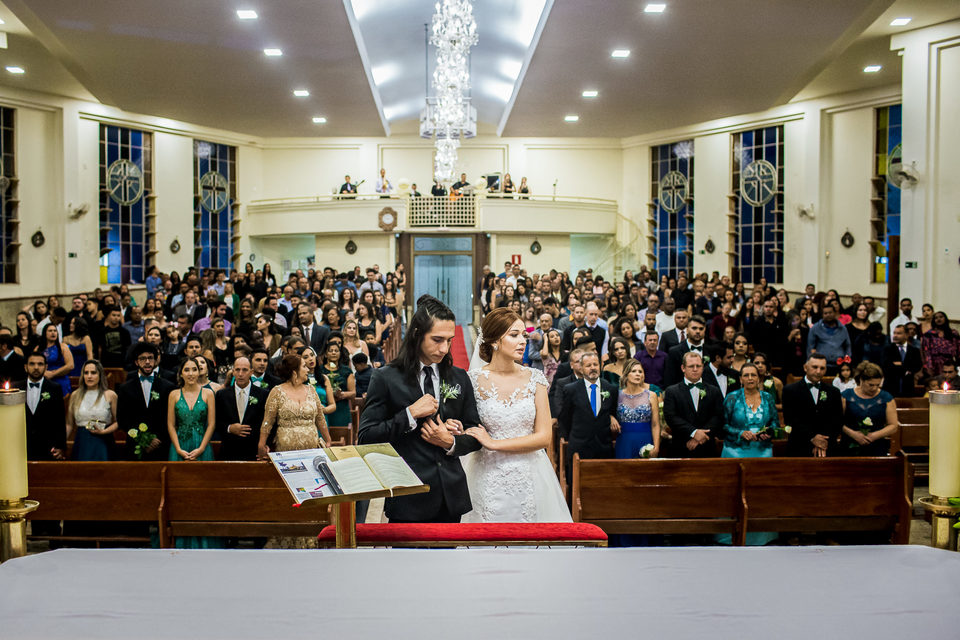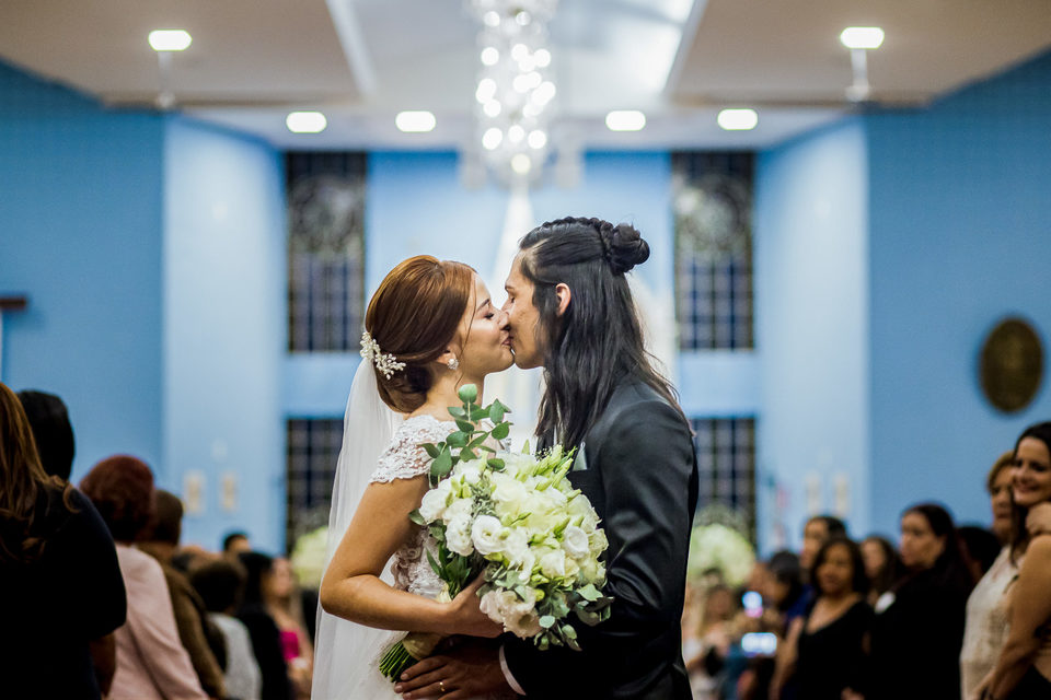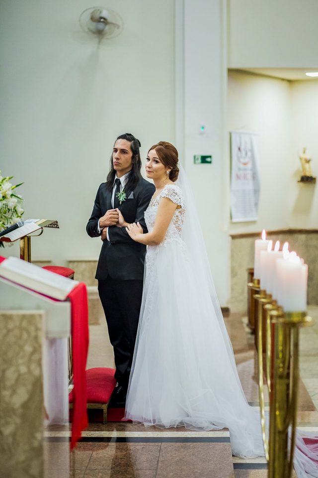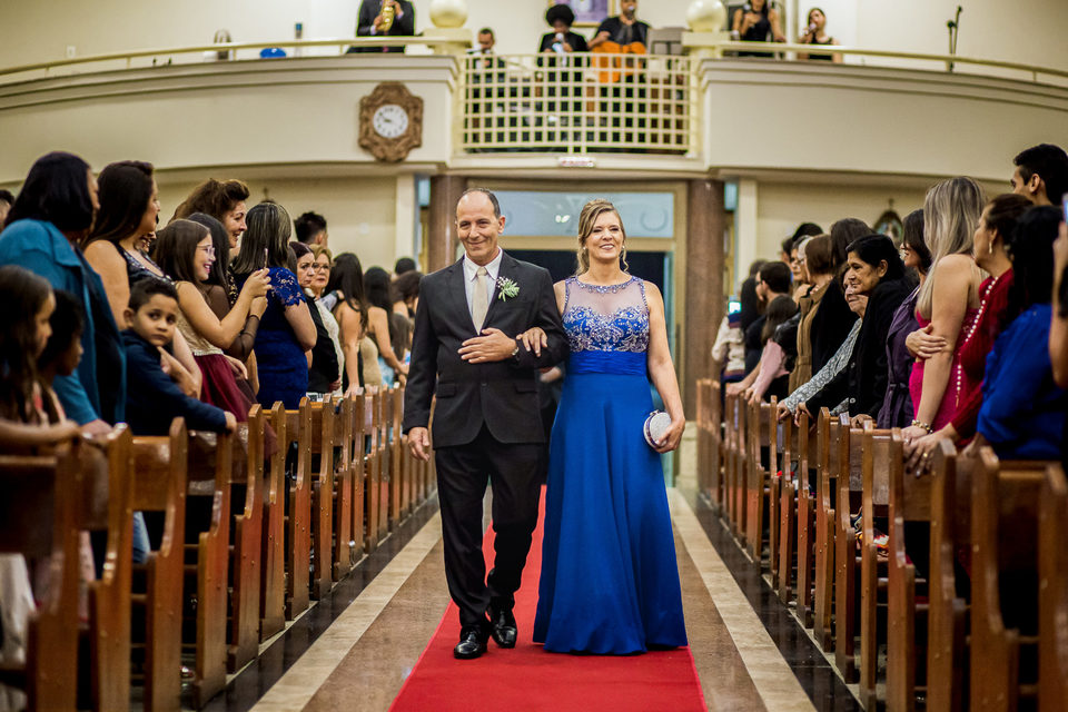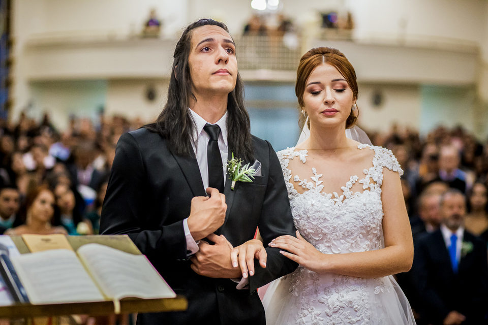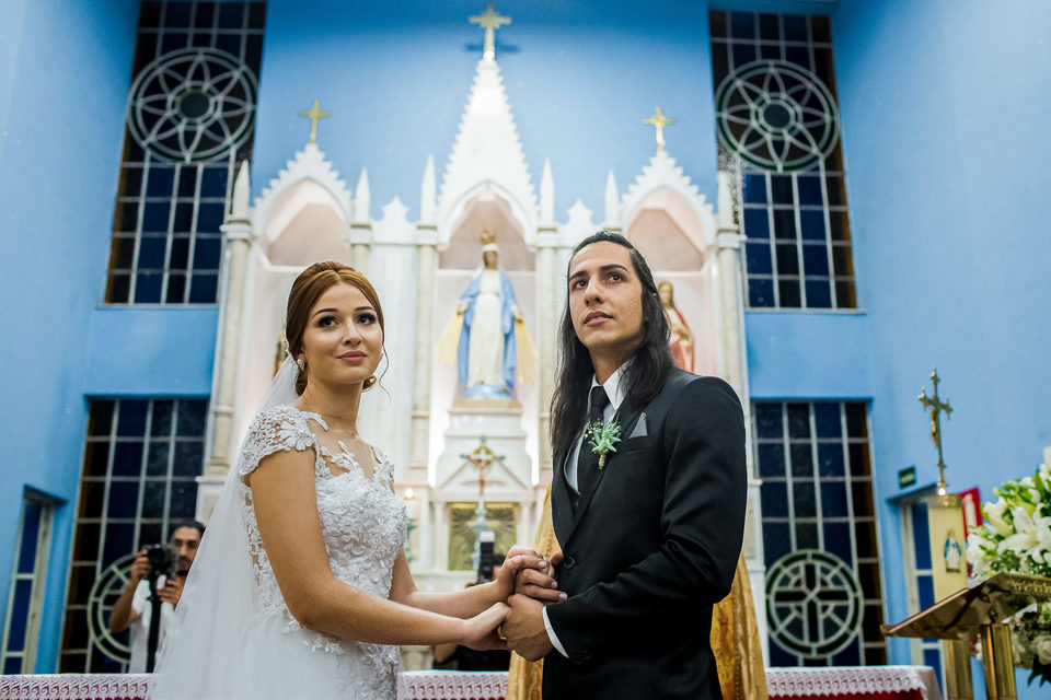 O Gustavo a esperou no altar com sua cruz, nervoso ele a apertava com muita vontade e ansioso para ver a amada, as portas se abriram e lá estava ela, linda, deslumbrante, em seu vestido de noiva longo branco contrastado com o azul das paredes da matriz. Uma linda noite para se dizer "sim". E foi o que eles fizeram!