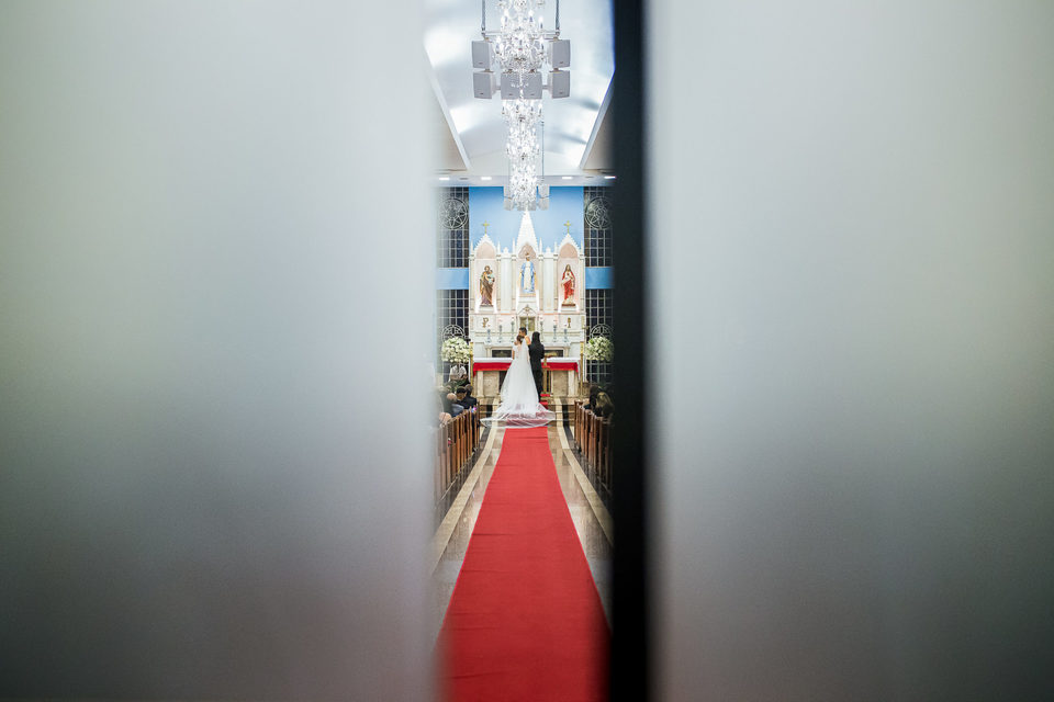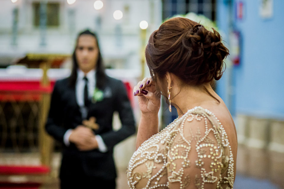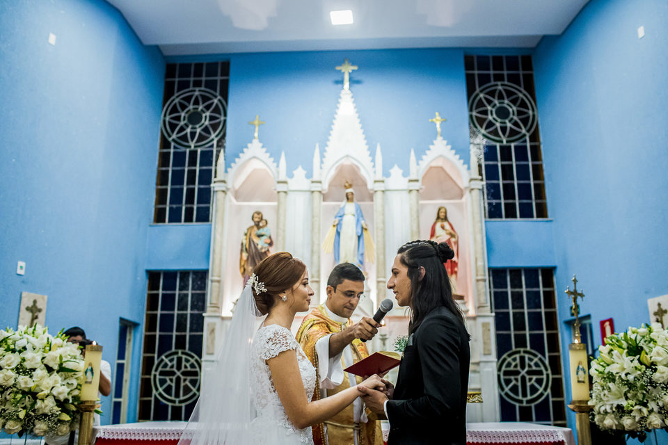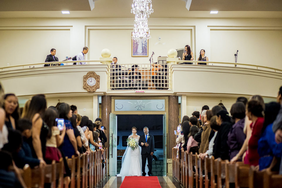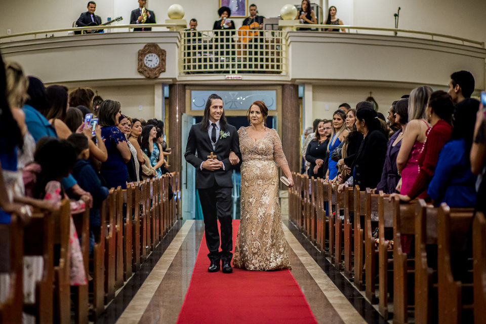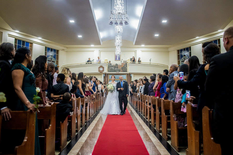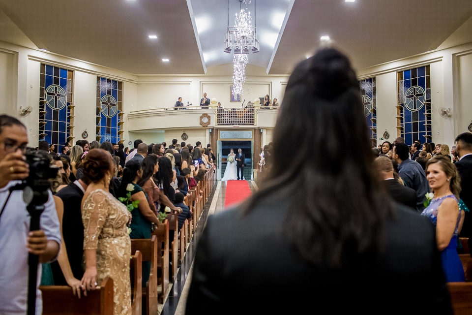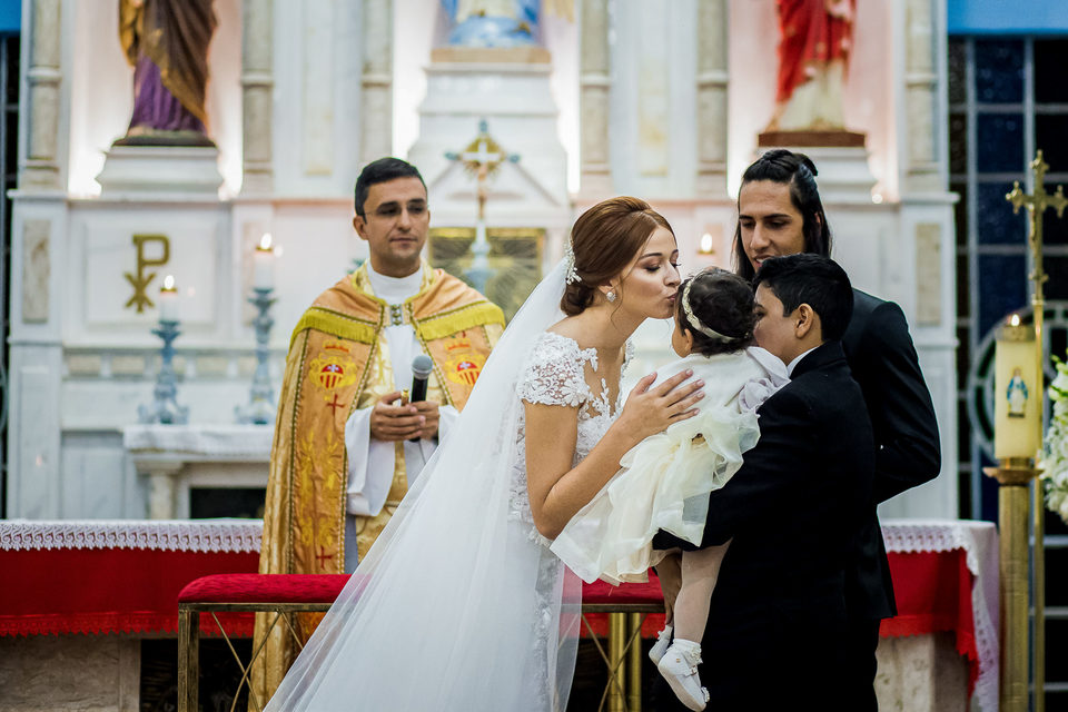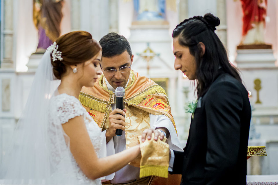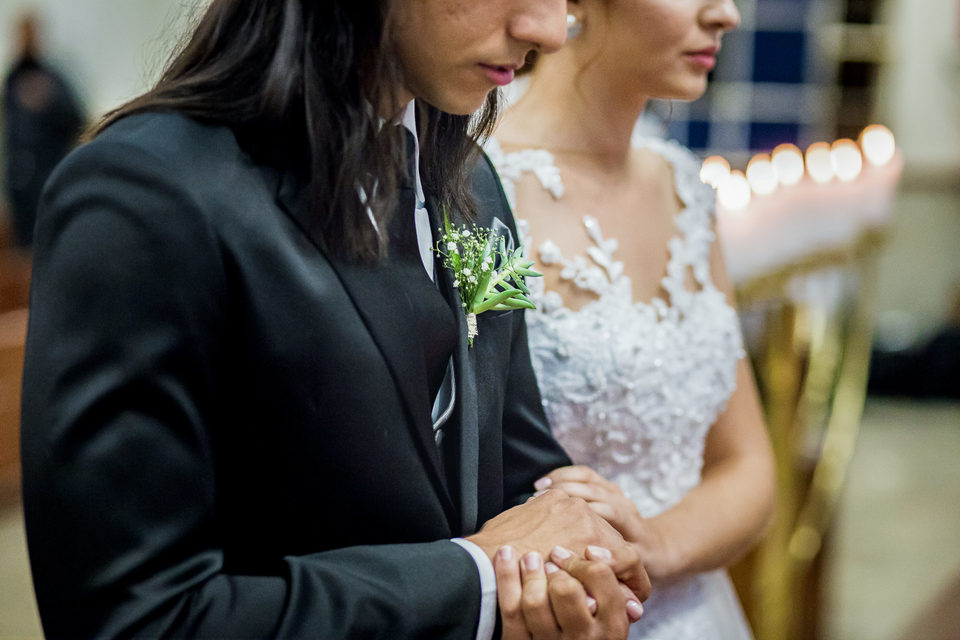 O Gustavo a esperou no altar com sua cruz, nervoso ele a apertava com muita vontade e ansioso para ver a amada, as portas se abriram e lá estava ela, linda, deslumbrante, em seu vestido de noiva longo branco contrastado com o azul das paredes da matriz. Uma linda noite para se dizer "sim". E foi o que eles fizeram!