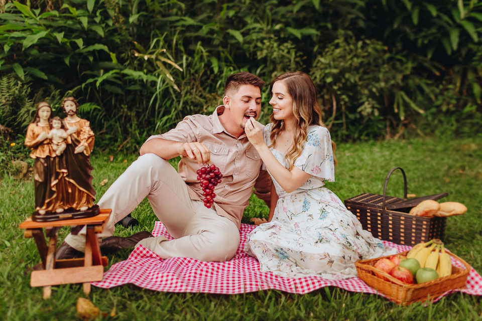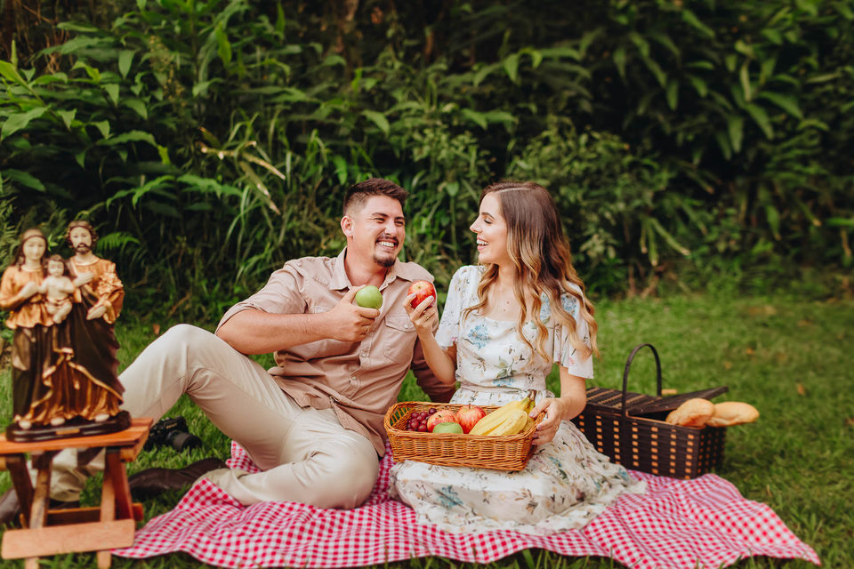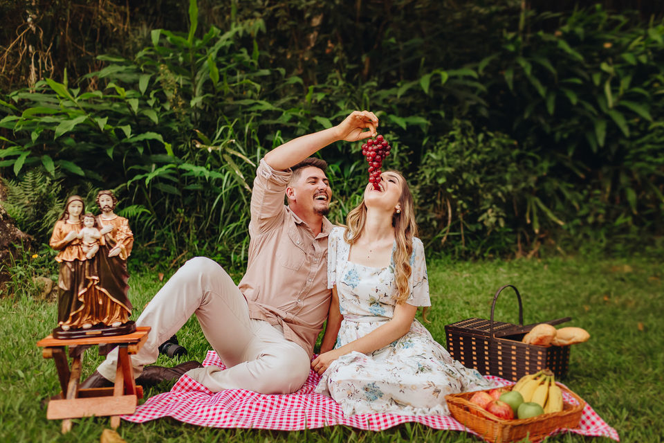 Tudo começou bem antes de começar. Acreditamos de todo o coração que Deus planejou esse momento desde a Criação. Finalmente chegou o momento de compartilhar com vocês um pouquinho dessa aventura. O César, homem de Deus, como todos sabem, sempre pediu a Deus uma mulher virtuosa e que "amasse a Deus mais que ele". Ele pedia uma mulher que desejasse a santidade em toda a sua plenitude, mas começou a acrescentar alguns detalhes, como "podia ser médica né Deus, esse povo médico é bonito" e outros detalhes a mais que não precisam ser citados. Acredito que quando Deus viu aquele bom homem, pedindo com tanta fé, Ele pensou: olha filho, tenho uma aqui pra você, mas ela ainda não está pronta não, calma aí, vai rezando." hahahah Enquanto isso, eu era o barro nas mãos do oleiro. Deus me conquistou primeiro, me fez apaixonar loucamente por meu Jesus, para depois me apaixonar pelo meu César. Em maio de 2017, surgiram algumas conversas, comentários em fotos do instagram, acompanhados de algumas orações, mas tudo bem superficial. Em 15 de junho desse mesmo ano, dia de Corpus Christi, era o dia de produzir tapetes, Nosso Senhor passaria por ali. Estávamos na Igreja de Nossa Senhora do Rosário, ele desenhava os tapetes e eu os coloria. Eu deveria estar me preparando para a grande festa da Igreja, mas só conseguia pensar em como aquele rapaz era divertido e bonito. César por outro lado, me olhava com tanto carinho, não demorou e foi direto ao ponto. Na capela pediu a Jesus: "Senhor, quero aquela moça para minha esposa." Que loucura né? Ele nem me conhecia. Mas a loucura dos homens é a sabedoria de Deus. Mais tarde, naquele mesmo dia, durante a procissão, vi César de longe, senti meu corpo arrepiar e o Espírito Santo disse ao meu coração: "Aquele é o seu marido." Lembro de pensar: Não, Senhor, aquele não, ele é bonito demais, me arruma um mais feinho. hahhaha Não teve jeito meu amor, sempre foi você. Bom, caminhamos juntos nesses últimos anos, crescemos juntos, conhecemos a modéstia, o que nos ajudou ainda mais a viver a castidade, crescemos na fé, nas orações e no amor. Cada dia que passa, Deus nos pede mais um passo e assim ele nos fez melhores amigos: Eu, César e Jesus. Desde o início, sabíamos que éramos um para o outro, era questão de tempo nos unirmos em matrimônio. Chegou a hora. Em 07 de fevereiro de 2020, em uma de suas brincadeiras, César me buscou em Dores do Indaiá (onde eu morava na época) e me levou (me enrolando com muitas histórias), apenas com a roupa do corpo e um chinelinho havaianas até a cidade de Lavras Novas, onde me surpreendeu em um castelo, com um pedido de noivado. O dia mais feliz da minha vida. Em nosso noivado, Deus continua conosco, pedindo que nos doemos cada vez mais, nos ensinando que o amor é decisão e devemos nos sacrificar pelo outro. Nesses três anos, continuo me surpreendendo com tudo o que Deus faz por nós. Em breve, o maior presente chegará: seremos um.