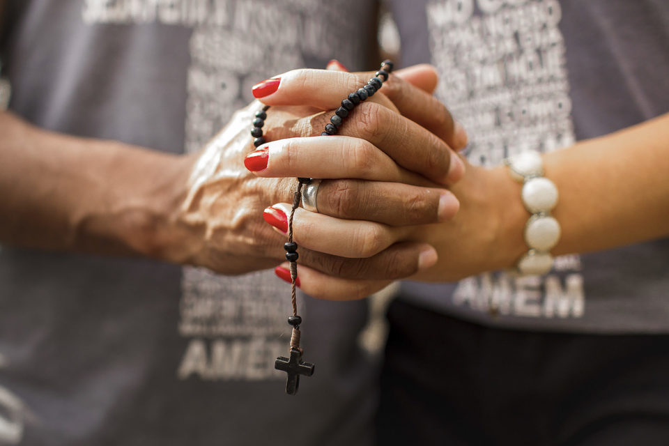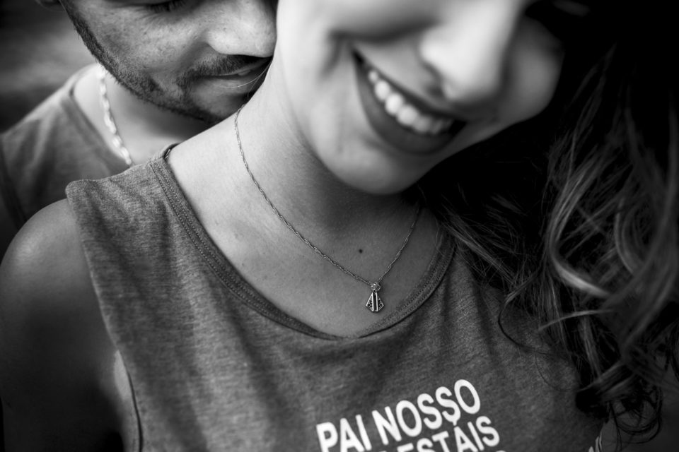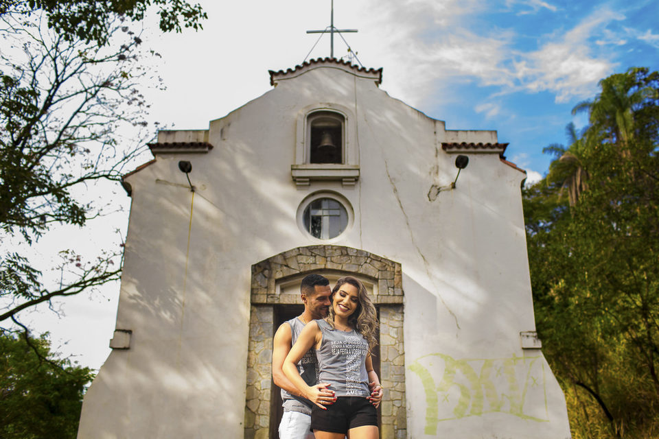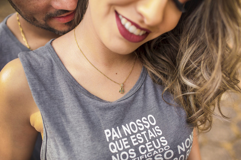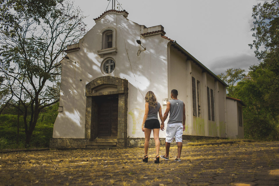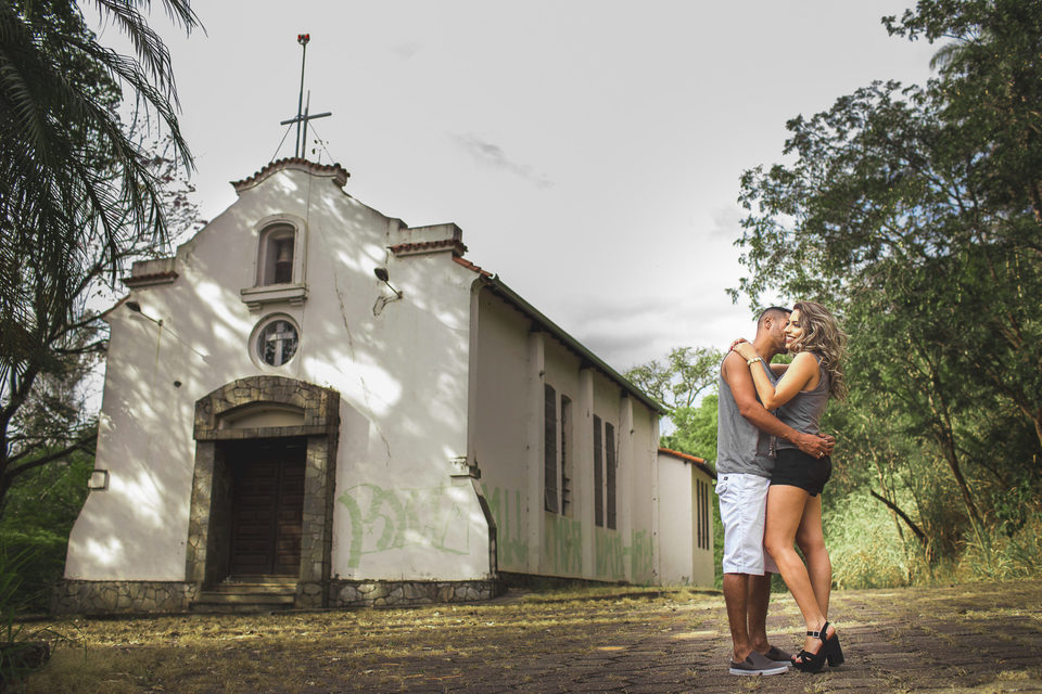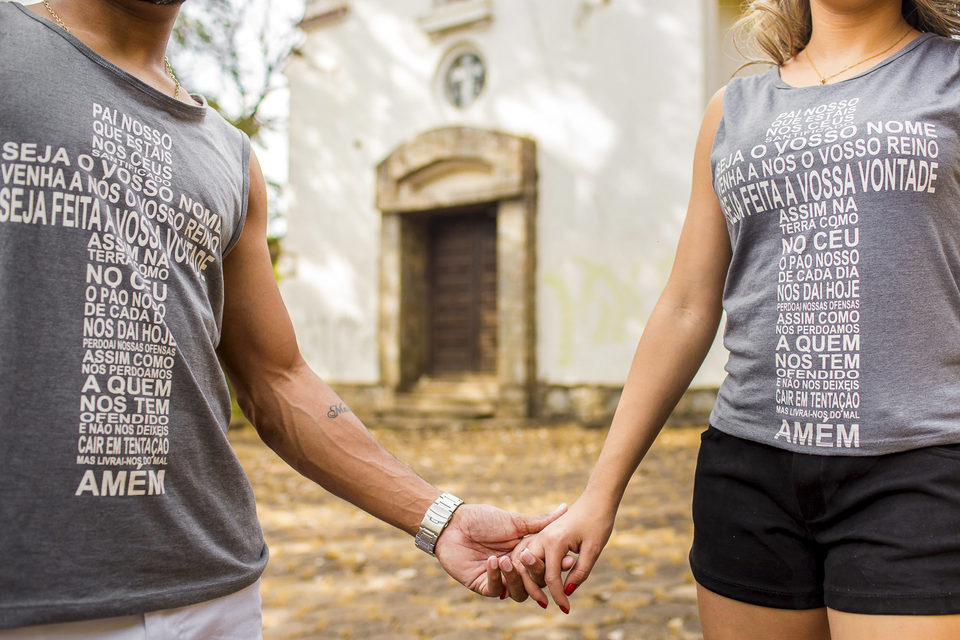 A Fran me pediu que tivesse isso no ensaio fotográfico pré casamento dela, algo que lembrasse essa raiz deles na igreja antes mesmo de serem um casal, algo que contasse em fotos como foi o início do relacionamento abençoado deles. E escolhemos a camisa da cruz com fotos na igreja pra simbolizar a essência deles. O Valdeci logo topou e abraçou a ideia, e tivemos a certeza que era a decisão mais acertada para retratar eles.