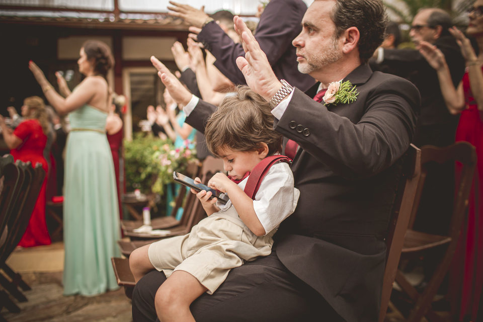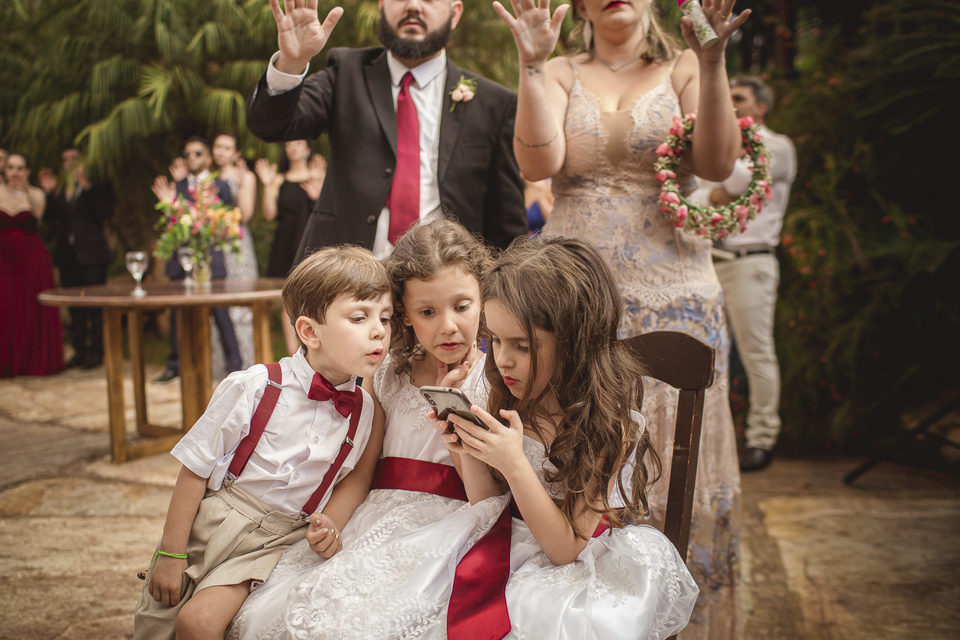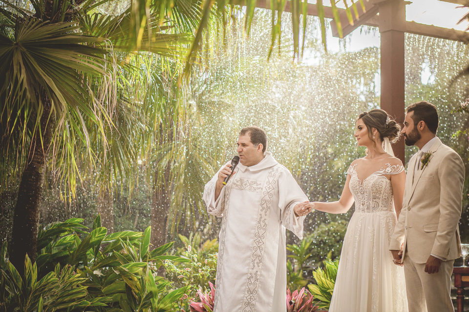 O momento foi chegando e com ele o tempo foi fechando, pois é, eu disse que o céu era azul e um lindo dia de sol né? Acontece que o tempo oscilou entre sol e nuvens. Quando eles entraram ( de forma muito emocionante, diga-se de passagem ) ainda reinava um solzinho de final de dia. Mas no meio da cerimônia acabou chovendo. Então foi um casamento com chuva em local aberto. Algo um pouco incomum de se ver.
