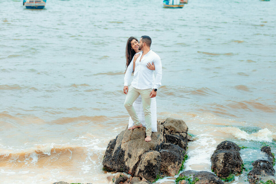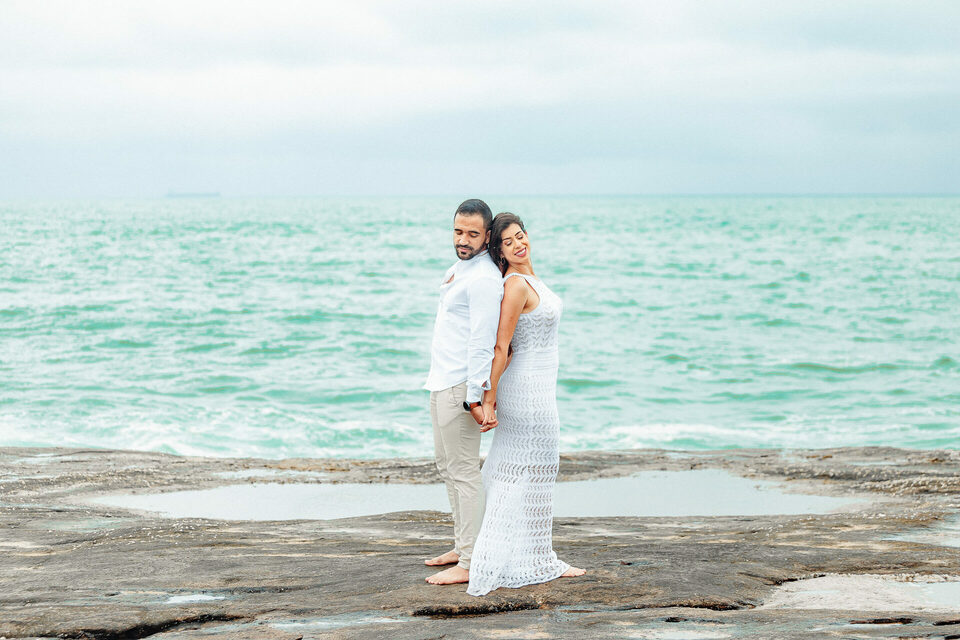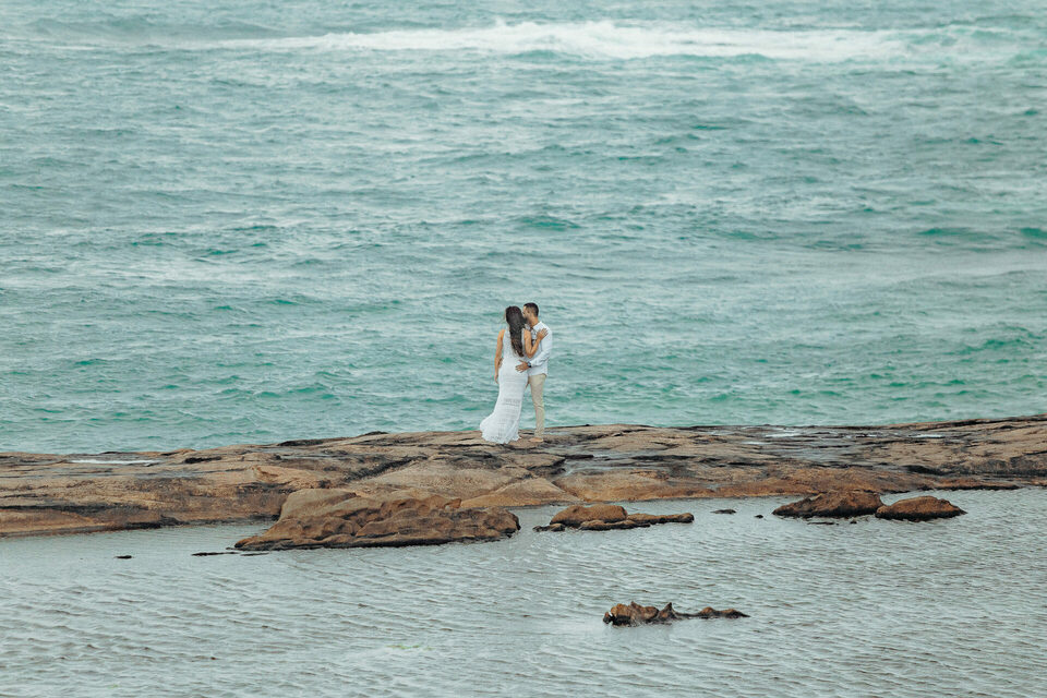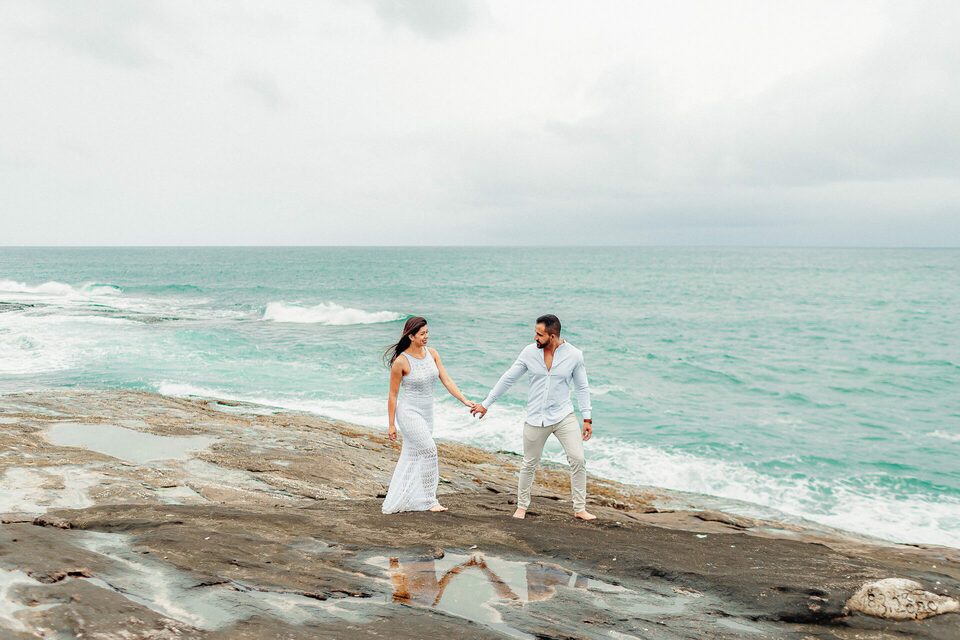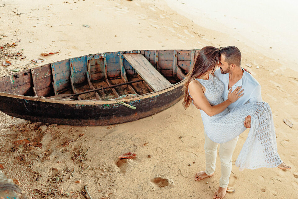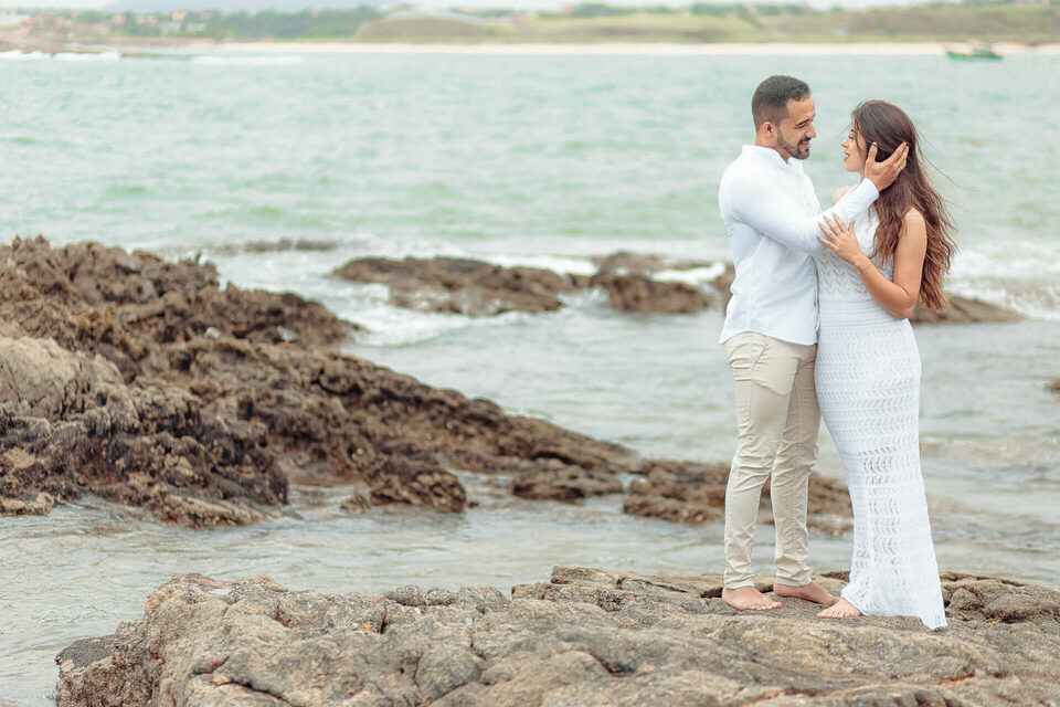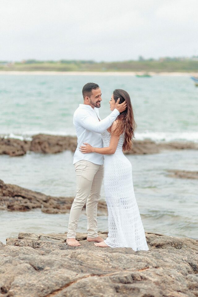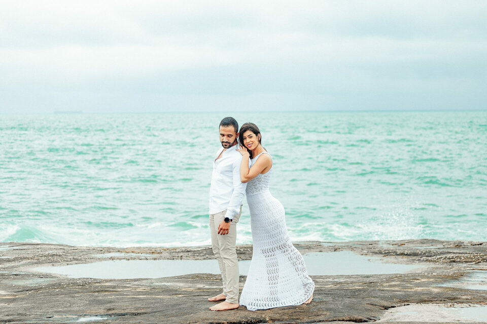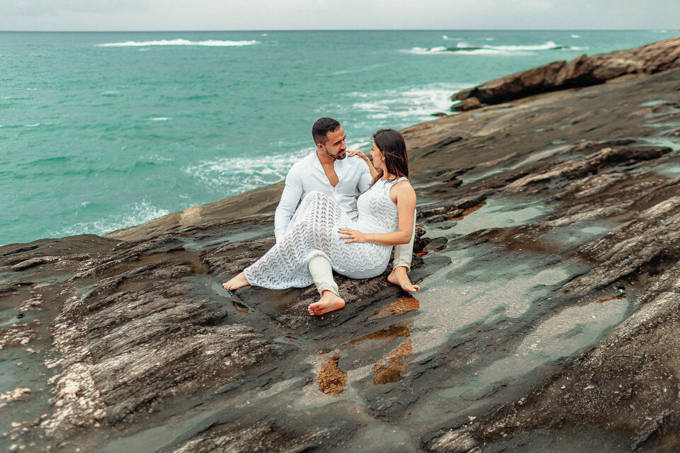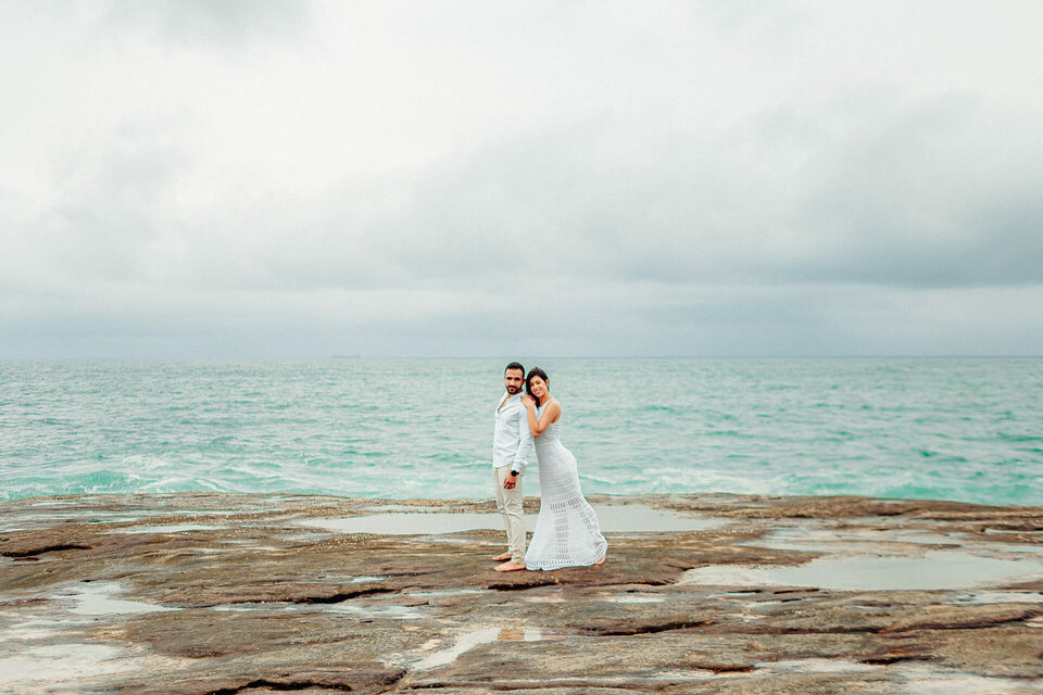 Começamos a bolar o ensaio deles, ja na reunião que nos conhecemos, acredite que ainda não havia nem um contrato assinado. Mas foi uma conexão tão legal, que a gente já fazia planos e falava sobre ideías sem nem mesmo estarmos com um acordo assinado. Eles são alegres, cheios de sorrisos e animação pra dar e vender. Então logo que surgiu o assunto da viagem, já passou um filme na minha cabeça, eu já os via correndo na beira do mar, com o evento balançando o cabelo dela, o Amaury a carregando, eles sorrindo, e aquela cena linda de filme passando pelo visor da tela da câmera. E pra ser sincero, foi muito mais lindo que imaginei. Pegamos paisagens incríveis, eles toparam tudo o que propomos com a maior humildade do mundo. Se lançaram de peito aberto no ensaio e se entregaram ao amor nessas fotos que transbordam sentimento.