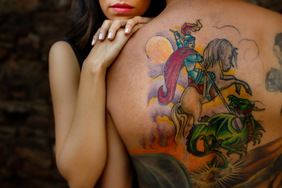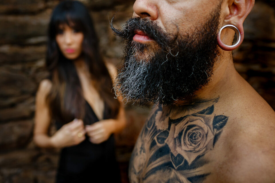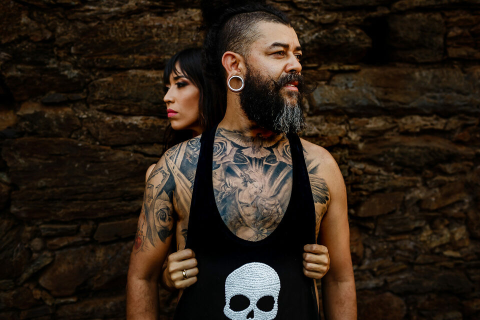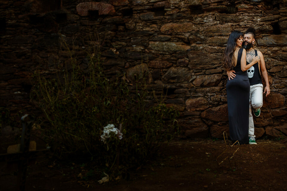 Achamos uma gruta, com uma linda capela dentro, era bem funda e pingava um pouco de água. Meio sombria e ideal para o que procurávamos. Fizemos algumas fotos e fotos em busca do cemitério. O Max tinha visto um na internet, em ruínas, bem rustico. Mas não sabia o nome. E aí andando pela estrada, por acaso achamos o tal cemitério em ruínas. Lindo, rústico, tudo aquilo que procurávamos estava ali. Fizemos fotos nos arredores, e entramos para fazer dentro também. Com roupas pretas e expondo as tatuagens, fizemos um pouco do book fotográfico de forma diferente do convencional.